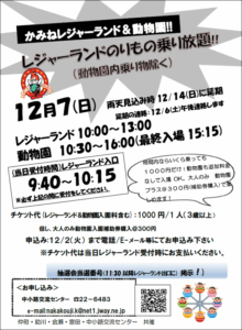 お知らせ ホーム > お知らせ一覧 > イベント・募集 > 12/7(日)「レジャーランド乗り物乗り放題!!」開催のお知らせ イベント・募集 202510.23 12/7(日)「レジャーランド乗り物乗り放題!!」開催のお知らせ 前の記事へ イベント・募集一覧にもどる 次の記事へ