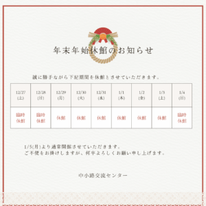 お知らせ ホーム > お知らせ一覧 > お知らせ > 年末年始休館のお知らせ お知らせ 202511.14 年末年始休館のお知らせ ご不便をおかけしますが、何卒よろしくお願い申し上げます。 前の記事へ お知らせ一覧にもどる 次の記事へ